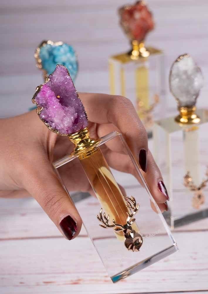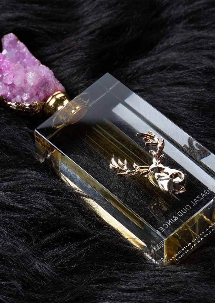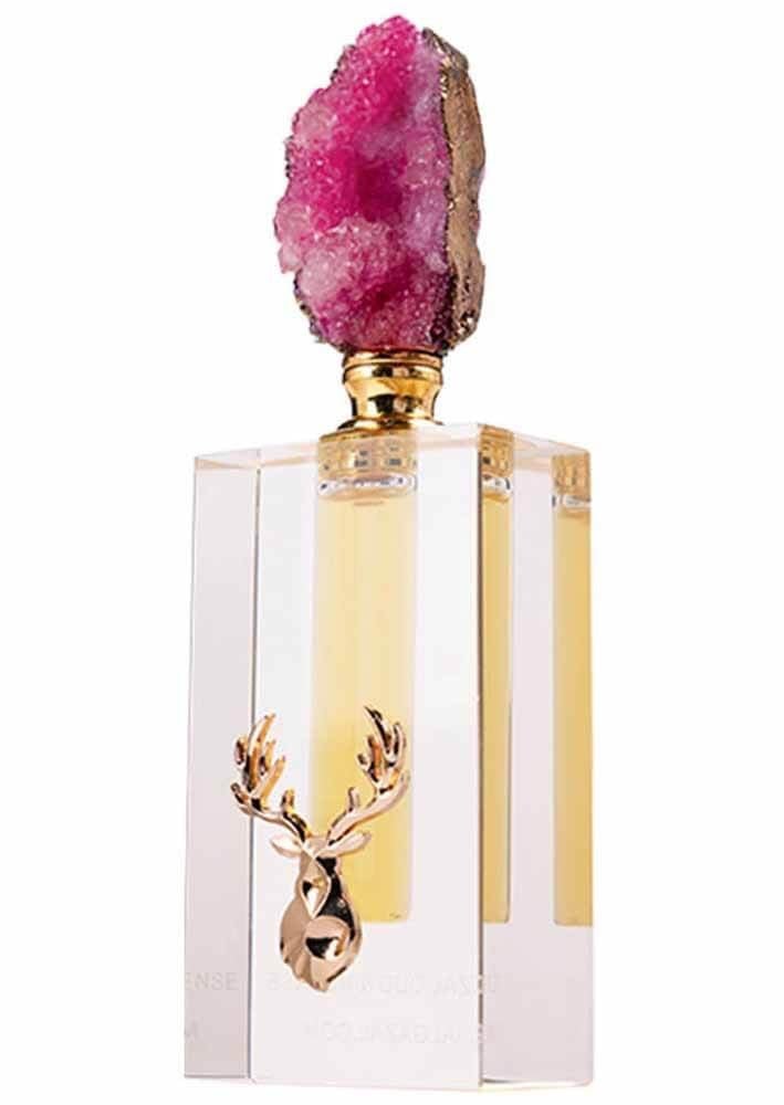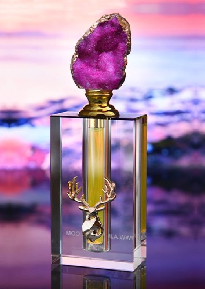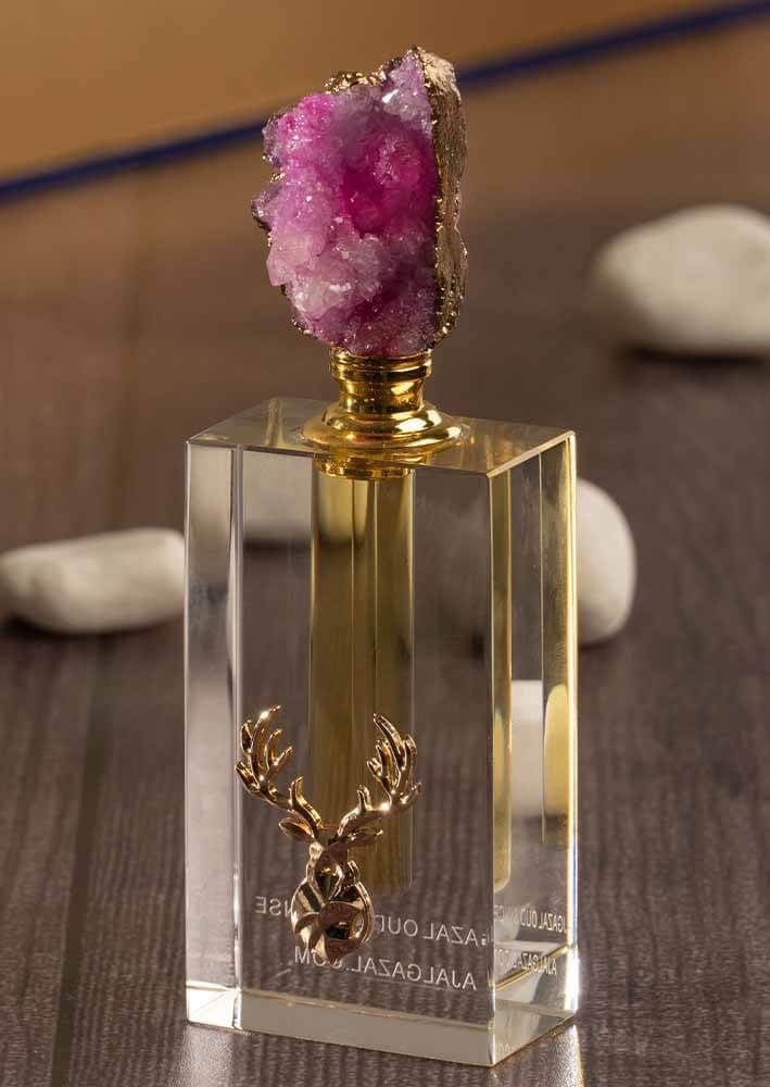 - تصميم زجاجة فاخرة: زجاجة كريستالية مصممة بعناية، تعكس الفخامة مع تاج من حجر كريم بنفسجي مصقول يدوياً.